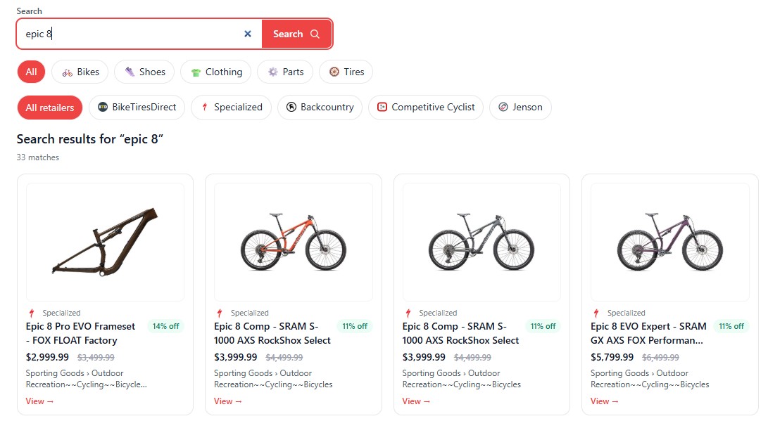 Search bikes, tires, shoes, and parts on sale across major retailers. Set alerts for when products go on sale.